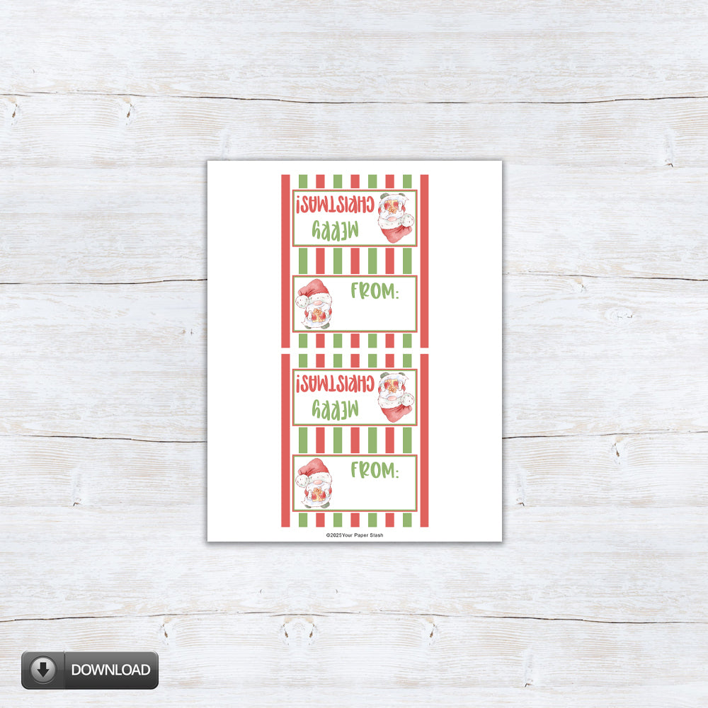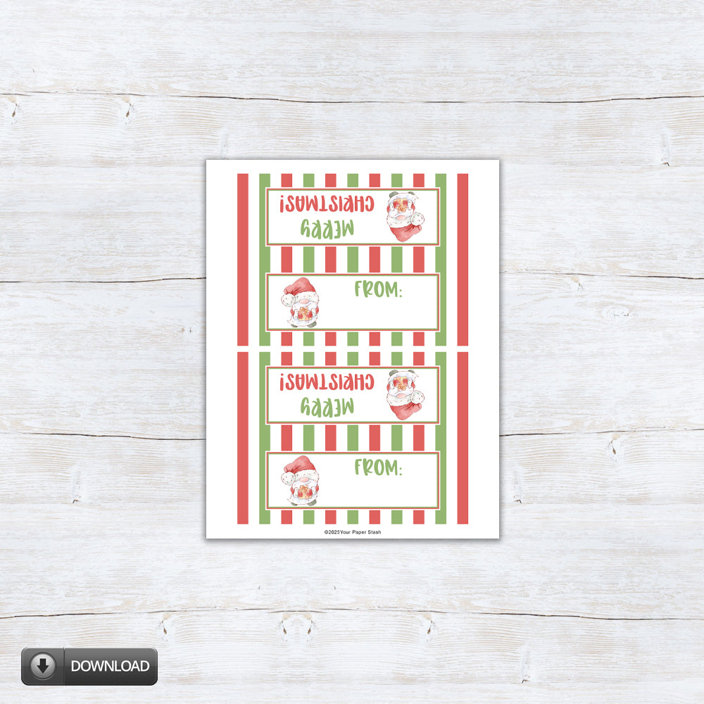 These "Merry Christmas" gnome bag toppers will add the finishing touch to your Christmas treats this year. You can use them to top candy bags, cookie bags, and other fun party favors. This download includes two sizes that fit over 4" and 6.5" treat bags.
